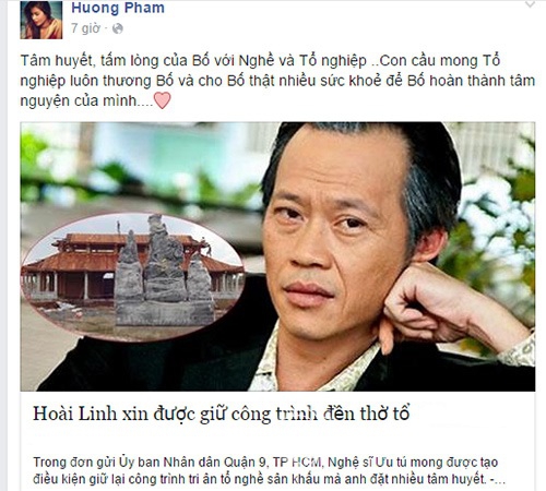 Trên trang cá nhân, Hoa hậu Phạm Hương đã lên tiếng ủng hộ Hoài Linh. Người đẹp viết: "Tâm huyết, tấm lòng của Bố với Nghề và Tổ nghiệp... Con cầu mong Tổ nghiệp luôn thương Bố và cho Bố thật nhiều sức khoẻ để Bố hoàn thành tâm nguyện của mình...".