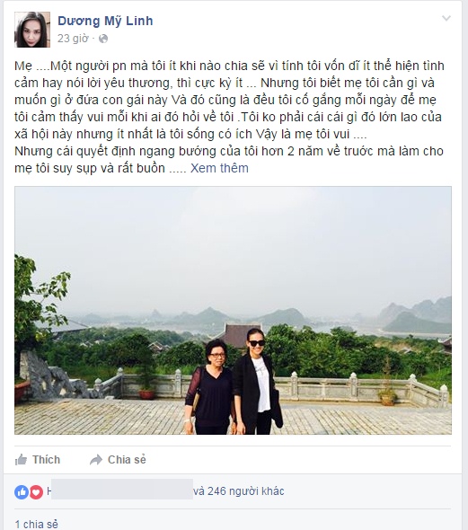 Còn về tôi, “sẽ là một câu chuyện dài nhưng không phải thời điểm này” khi con người ta càng trải qua nhiều sống gió thì tâm càng bình lặng. Mong mẹ luôn khoẻ mạnh và hãy vui vì con đang trên đường cố gắng, dù cho con đường nào, thì con cũng sẽ sống tốt hơn... Bởi con biết đó là niềm duy nhất mẹ mong muốn cho con”.