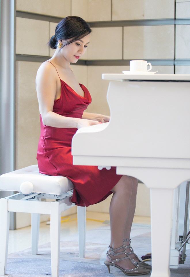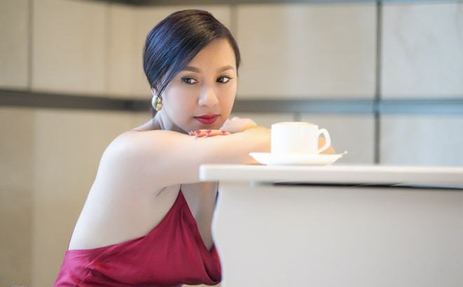 Đến điểm hẹn với phóng viên tại một khách sạn ở TP HCM, biểu tượng gợi cảm của thập niên 1990 xuất hiện rạng rỡ trong bộ đầm hai dây, trông cô quyến rũ và tràn đầy sức sống dù đã gần ngưỡng 40.