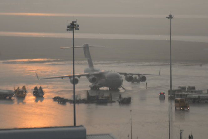 Máy bay US Air Force C-17 hạ cánh xuống sân bay Tân Sơn Nhất trong lúc trời mưa rất to.