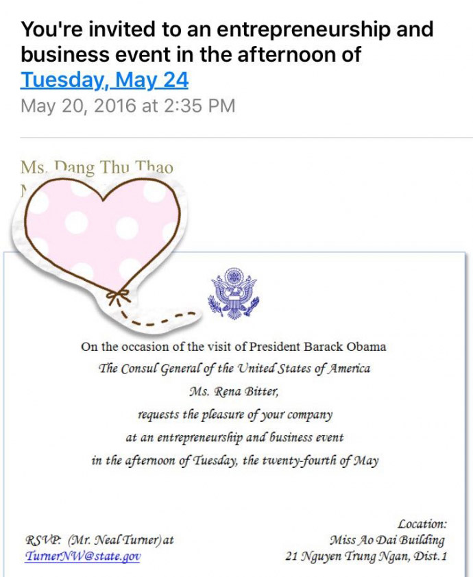 Liên lạc với hoa hậu Thu Thảo, cô cho biết đã nhận được lời mời của Lãnh sự quán Mỹ tại TP HCM tới tham dự bữa tiệc riêng tư với sự có mặt đặc biệt của Tổng thống Mỹ Obama cùng rất nhiều đại diện của các doanh nghiệp trẻ trên địa bàn cả nước.