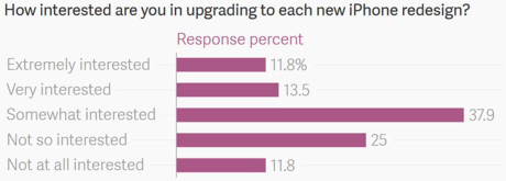 Một cuộc khảo sát được tiến hành bởi Quartz cho thấy, có ít hơn 10% người dùng iPhone sẽ nâng cấp lên phiên bản tiếp theo của thiết bị nếu mô hình không được thiết kế lại.