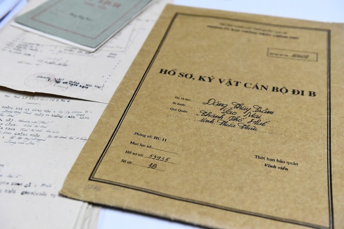 Thăm Trung tâm Lưu trữ quốc gia 3, đại sứ Marc Knapper được xem hồ sơ đi B của liệt sĩ Đặng Thùy Trâm gồm lý lịch, thẻ cán bộ, sổ đoàn.
