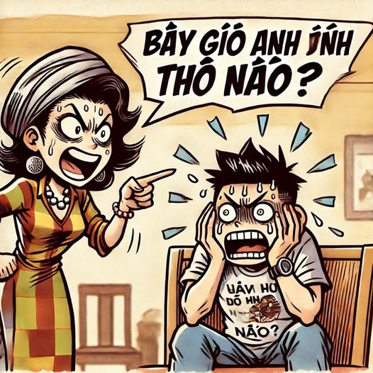 - Này nhé, vợ hơi quá rồi đấy! Chồng đi làm mệt mỏi, vợ chả thèm hỏi thăm, vợ lại đi hỏi thăm thằng Định? Á à? Hay là vợ nhớ thằng Định? Mà tại sao vợ biết tôi chơi với thằng Định hả? Hay là vợ bí mật nhắn tin với nó hả?