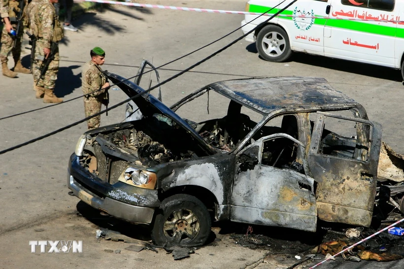 Chiếc xe bị phá tan tành sau một không kích qua drone ở Braiqaa, Liban, ngày 20/4/2025