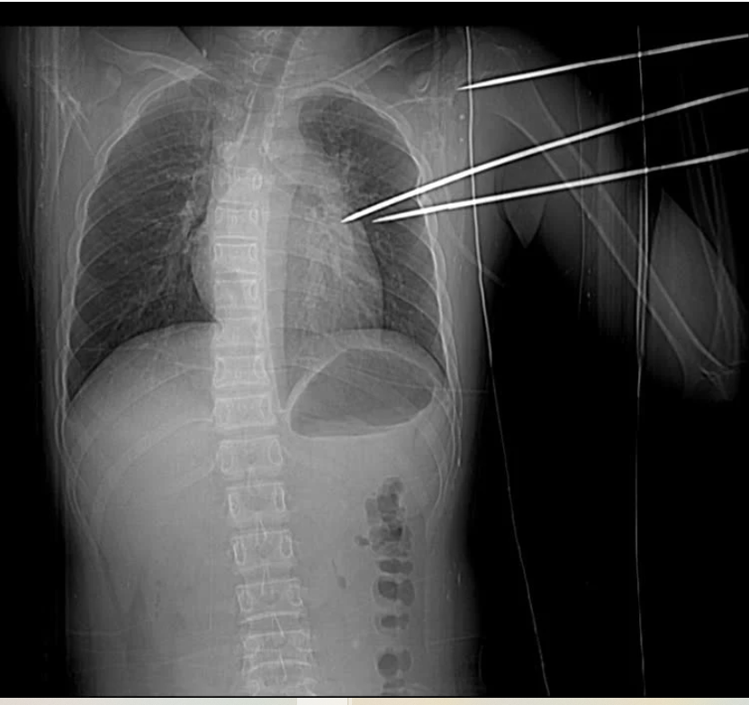 Hình ảnh chụp X-quang và CT cho thấy dị vật không chỉ xuyên qua mặt sau vai trái mà còn xuyên qua mô thùy trên phổi trái, đâm vào thành bên thất trái của tim, gây tràn máu màng tim – một tổn thương cực kỳ nghiêm trọng.