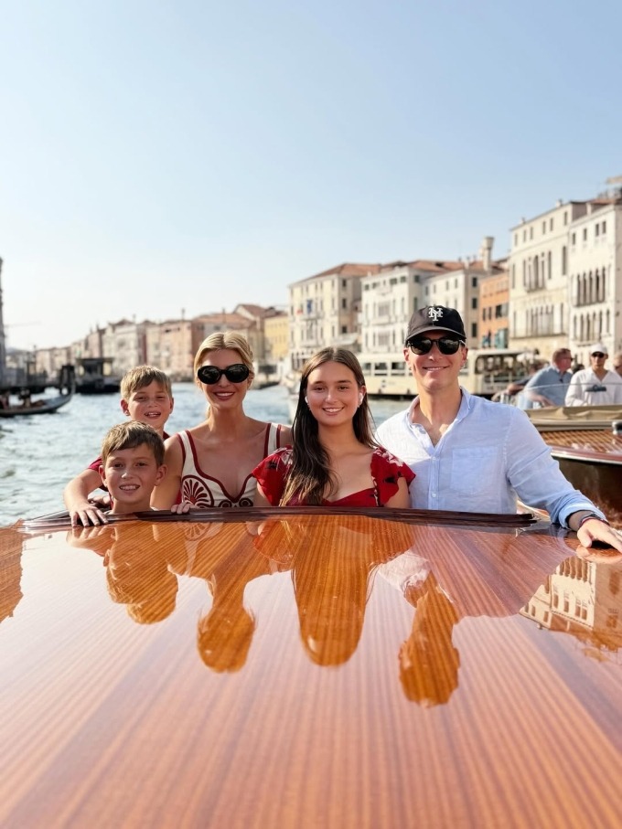Vợ chồng Ivanka Trump đưa ba con đi cùng trong chuyến đến Italy để dự hôn lễ kéo dài ba ngày của tỷ phú Jeff Bezos và cựu MC Lauren Sánchez. Theo People, cả gia đình đến đây từ hôm 24/6 bằng máy bay phản lực. Họ tranh thủ đi thuyền trên sông ngắm thành phố, tham gia lớp học thổi thủy tinh truyền thống của địa phương.
