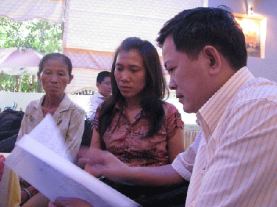 Chị Tuyền và mẹ ruột anh Nhựt trao đổi với Luật Sư Trần Đ́nh Triển về nội dung làm việc với cơ quan CSĐT công an tỉnh B́nh Dương. (H́nh: Người Lao Động)