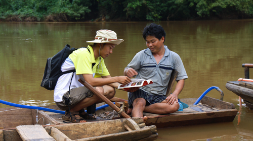 | Cán bộ đoàn khảo sát Viện Sinh học nhiệt đới trao đổi với ngư dân trên sông Đồng Nai (cách nơi dự kiến xây đập thủy điện 6A hơn 1km) - Ảnh: Đức Tuyên |