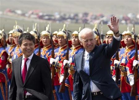 Mới đây nhất là chuyến thăm của Phó Tổng thống Mỹ Joe Biden. Tuyên bố với giới báo chí khi tới Ulan Bato, ông Biden đánh giá “Mông Cổ “là một nước bạn, là một đối tác của Mỹ”, theo đó, Mỹ ủng hộ một nước Mông Cổ phồn vinh và tích cực tham gia giải quyết các vấn đề khu vực. Phó Tổng thống Mỹ cũng khẳng định, Washington cam kết giúp người dân Ulan Bato xây dựng tương lai tốt đẹp hơn và nhấn mạnh rằng, Tổng thống Obama cũng đặc biệt quan tâm tới sự tiến bộ của Mông Cổ.