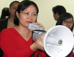 Đại diện cư dân còn mang cả loa cỡ lớn đến để yêu cầu chủ đầu tư thực hiện đúng nhiệm vụ cung cấp đầy đủ dịch vụ. Ảnh: