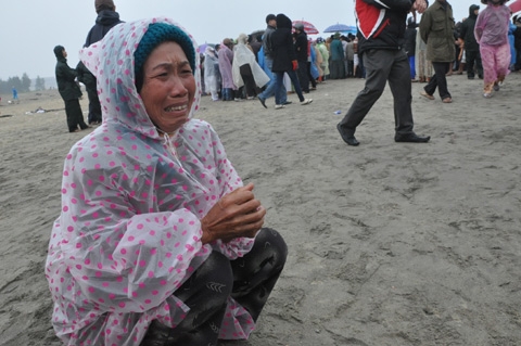 Hàng ngh́n người dân cùng thân nhân những người bị nạn lũ lượt kéo nhau ra băi biển ngóng trông và cầu nguyện xác các quân nhân sớm được t́m thấy.