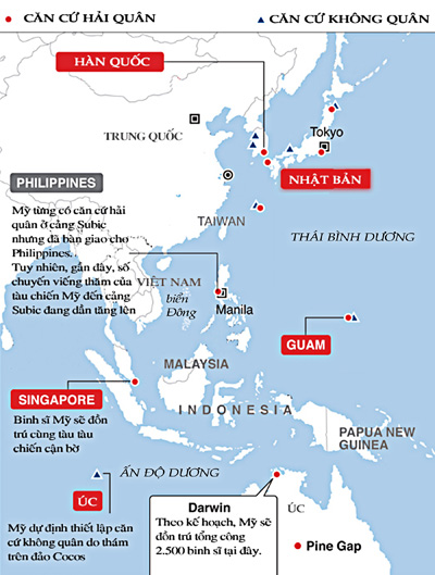 Chưa bao giờ châu Á - TBD, đặc biệt là Đông Á, lại trở thành điểm đến cấp tập của giới chức quân sự và ngoại giao Mỹ như trong 2 năm trở lại đây. Những động thái này nằm trong chiến lược chuyển trọng tâm về khu vực của Tổng thống Barack Obama. Washington đang ráo riết thắt chặt quan hệ đồng minh, tăng cường sức mạnh cho các căn cứ cũng như quay lại một số căn cứ cũ.