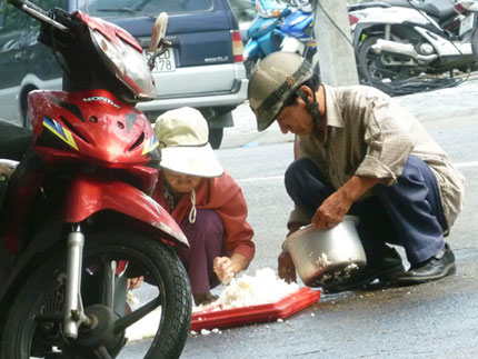 Tất nhiên bị đổ cơm như thế ai mà chẳng tiếc. Nhưng tiếc của đến mức hốt cả cơm đổ giữa đường đem bán cho khách thì thực sự là không thể chấp nhận được!