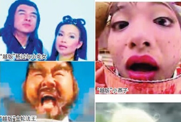 Các nhân vật trong phim Trung Quốc khi bị nhái bằng phiên bản Việt: (cột bên trái, từ trên xuống) Dương Quá và Tiểu Long Nữ của Đan Trường - Cẩm Ly, Kim Luân Pháp Vương phiên bản Việt, Tôn Ngộ Không Việt Nam. Cột phải: Tiểu Yến Tử phiên bản Việt và Phong Thanh Dương phiên bản Việt.