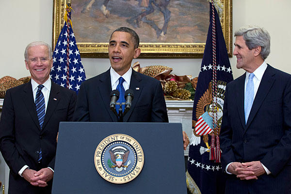 Tổng thống Obama (giữa) công bố việc đề cử ông John Kerry (bên phải) vào vị trí Bộ trưởng Ngoại giao Mỹ trong nhiệm kỳ sắp tới.