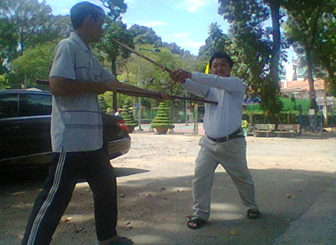 | Ảnh minh họa: Đâm trường côn vào chấn thủy. Biểu diễn: Võ Sư Nguyễn Hữu Trí (bên trái) và tác giả (bên phải) |