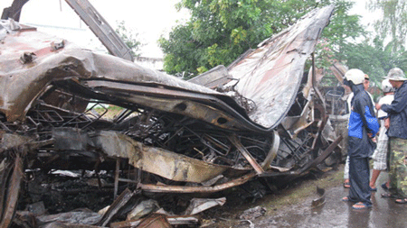 | Hiện trường vụ tai nạn thảm khốc do container gây ra làm 10 người chết. |