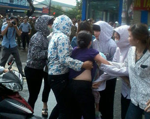 Chị Bùi Thị Minh Hằng bị đám người mặc thường phục bắt đi khi chị muốn tham dự Phiên tòa xử phúc thẩm Các thanh niên Công giáo và Tin lành sáng 23.5.2013./Photo courtesy of VRNs.