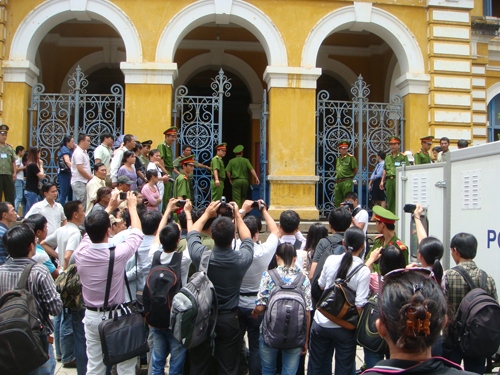 Phóng viên tác nghiệp ở tòa - Ảnh: Lê Nga