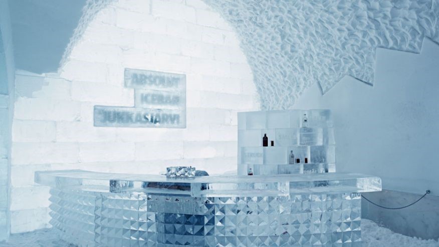 Các khách sạn băng và quán bar ở làng Jukkasjarvi được tái tạo hàng năm, với sự đóng góp của các nghệ sĩ từ khắp nơi trên thế giới; nó có đặc điểm tầng tuyết, đồ gỗ chạm khắc băng, và các đồ dùng trong quán bar. Mặc đồ ấm nhất của bạn (và đôi giày gần ngón) nếu bạn có kế hoạch nhâm nhi một ly cocktail trong phòng chờ lạnh lẽo này, nổi tiếng là điểm đến đầu tiên của đồ uống subzero. -Sarah Brüning