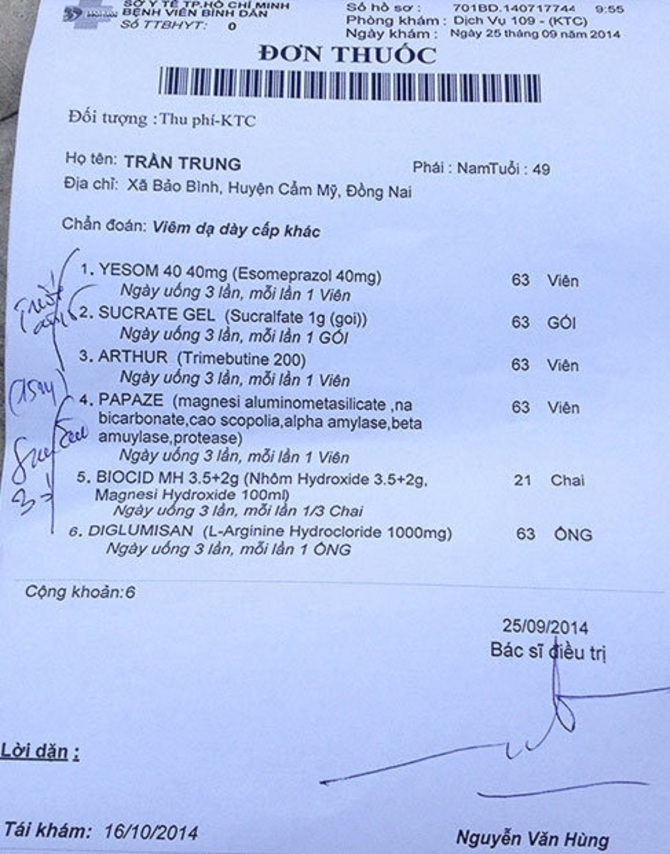 Cũng liên quan đến việc “móc túi” người bệnh qua đơn thuốc, mới đây, đồng nghiệp của chúng tôi tại TP.Hồ Chí Minh cũng chia sẻ một trường hợp bệnh nhân khi đến khám bệnh đã nhận được từ bác sỹ thăm khám một đơn thuốc với tổng giá lên tới gần 5 triệu đồng/đơn thuốc. Bệnh nhân là ông N.D.T. (64 tuổi, TP.HCM) đến bệnh viện Bình Dân khám bệnh vì đi tiểu khó. Bác sỹ Nguyễn Bá Minh Nhật chẩn đoán ông T. bị bệnh trĩ và phì đại tiền liệt tuyến, kê toa cho ông năm loại thuốc uống trong nửa tháng với giá 5 triệu đồng. Trong đơn thuốc có kê 30 viên Winman - một loại thực phẩm chức năng (TPCN) tăng cường sinh lý (theo quy định, cấm bác sỹ kê TPCN vào đơn thuốc cho bệnh nhân).