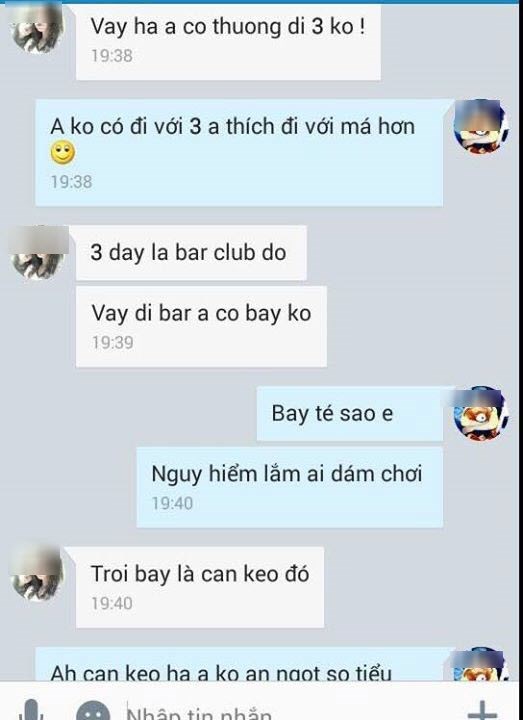 A liền trả lời ngây ngô là: “Bay té sao em. Nguy hiểm lắm, ai dám chơi”. Ngay lập tức, P liền phán rằng: “Bay là cắn kẹo hay cắn thuốc lắc. Người ta gọi là đi bay”, đồng thời chê A là "lúa" và không phải dân chơi khi nhắn: “Nghe nói chuyện là biết không phải dân chơi rồi. Lúc đầu nhìn tưởng dân chơi. Ai ngờ hai lúa nửa mùa, đi bar mà không biết bay”.