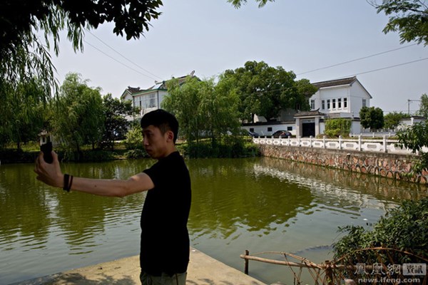 Một thanh niên đang chụp ảnh trước vườn nhà họ Chu.
