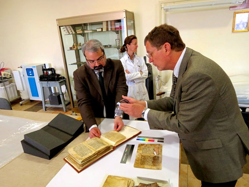 Các nhà khoa học đang chụp lại ảnh bản thảo cổ bằng tiếng Syria ở vu viện Vatican. Ảnh: NY Times
