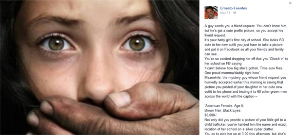 Một facebook của người nước ngoài tên Ernesto Fuentes đăng bài viết cảnh báo một vụ bắt cóc và bán bé gái 5 tuổi người Mỹ với giá 5.000 USD cho một kẻ mắc chứng thích quan hệ với trẻ em khiến nhiều người giật mình.