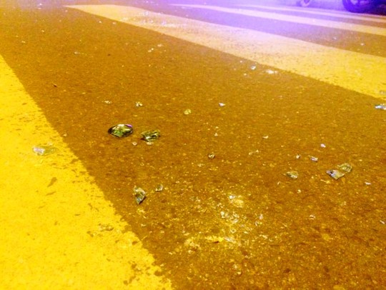 Tại hiện trường, rất nhiểu mảnh thủy tinh vỡ nằm rải rác trên mặt đường, gây khó khăn cho người đi đường.