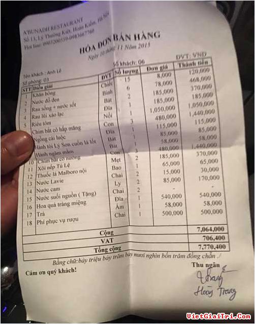 Thông tin này xuất hiện trên trang cá nhân của chị L., vợ của một trong 4 vị khách dự bữa ăn bị tính giá cắt cổ trên. Theo thông tin chia sẻ, chồng chị L. cùng 3 người bạn dùng bữa tối tại nhà hàng A"bunadh (13 Lý Thường Kiệt, Hoàn Kiếm, Hà Nội),hóa đơn sau bữa ăn này lên tới 7 triệu 770 nghìn đồng.