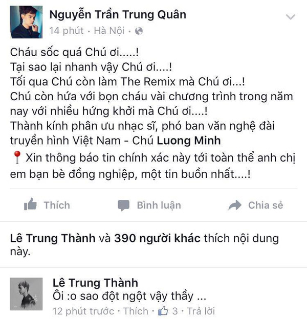 Cách đây ít phút, ca sĩ Nguyễn Trần Trung Quân đã thông báo tin buồn này tới toàn bộ các nghệ sĩ, đồng nghiệp đã từng làm việc với nhạc sĩ Lương Minh trên trang cá nhân. Nam ca sĩ bày tỏ sự đau đớn và bất ngờ trước sự ra đi của người chú đáng kính.