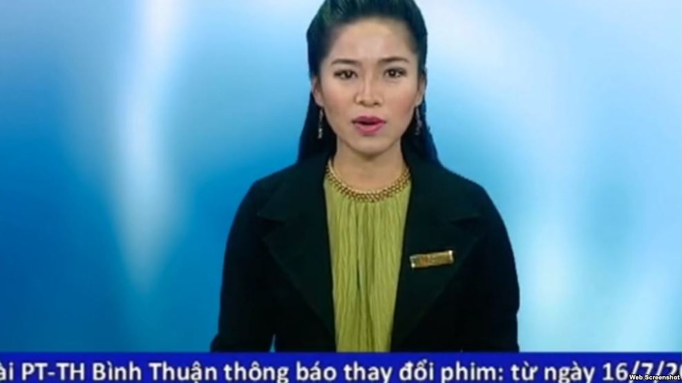 Thu Thủy đang thông báo quyết định ngưng chiếu phim “Tân Bến Thượng Hải” trên đài truyền hình Bình Thuận hôm thứ Bảy 16/7.