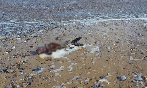 Phần giữa xác chết gần như mục rữa, trong khi đầu và đuôi tương đối nguyên vẹn. Jones chia sẻ những bức ảnh trên Facebook, thu hút nhiều sự quan tâm. "Hôm nay ở Great Yarmouth, chúng tôi tìm thấy một thứ trông giống người cá dạt vào bờ biển", Jones viết.