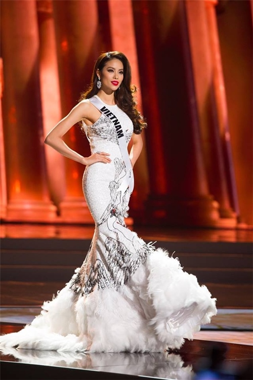 Hoa hậu Phạm Hương mặc váy lông vũ ở phần đuôi cá trông bồng bềnh như đám mây
