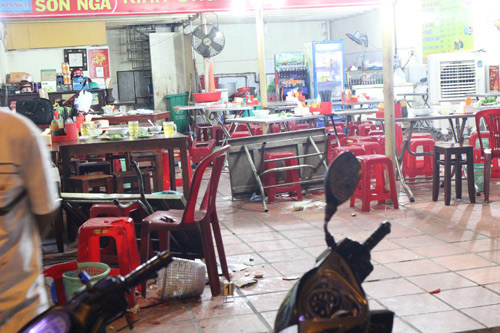 Khoảng 10 phút sau, vị khách này cùng 4 thanh niên khác cầm mã tấu, tuýp sắt xông vào quán phở đập bàn ghế, tủ kính đựng thịt gà. Nhiều khách và nhân viên quán phở tháo chạy thục mạng.