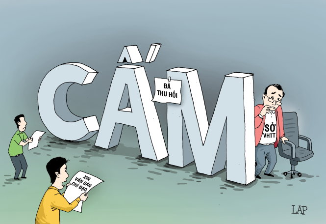 Nhưng trước đó ba ngày, ngày 7-3, Sở Văn hóa - thể thao TP.HCM đã rất sốt sắng gửi đi văn bản - do ông Võ Trọng Nam, phó giám đốc Sở ký - nhằm phổ biến đến các doanh nghiệp trong lĩnh vực giải trí biết “để thực hiện” quyết định về việc “tạm ngưng lưu hành một số bài hát đã cấp phép phổ biến” trên.