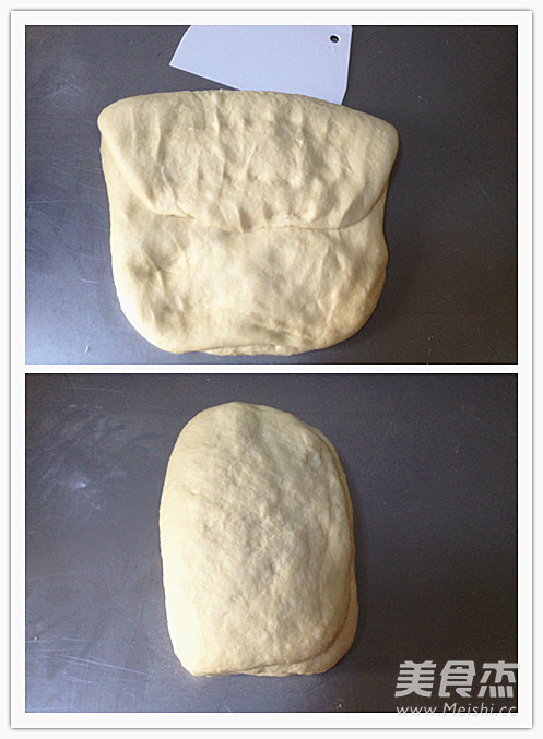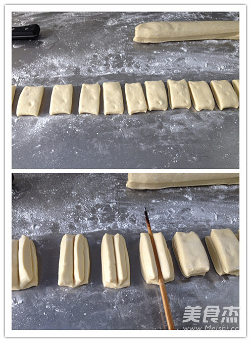 - Sau khi bóc lớp túi ra khỏi khuôn bột, rắc lên bề mặt một ít bột mỳ, cắt đôi phần bột rồi chia dần. Sau đó kéo dài như hình.