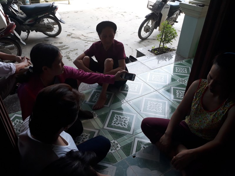 Trong căn nhà nhỏ của bà Phúc, 5-6 hàng xóm đang tập trung tại đây để hỏi thăm và chia sẻ câu chuyện không may.