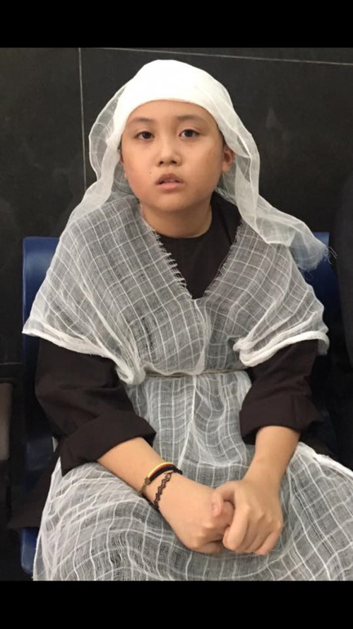 Bé Gà mặc đồ tang trong ngày mất của bố.