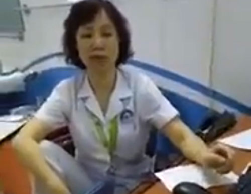 Bác sĩ Nguyễn Thị Minh, khoa Mắt trẻ em, Bệnh viện Mắt Trung ương (Hà Nội) gác chân lên ghế khi đối thoại người nhà bệnh nhân. Nữ bác sĩ này đã nhận quyết định kỷ luật. Bệnh viện đã hạ một bậc thi đua tháng 9 với bác sĩ Minh.