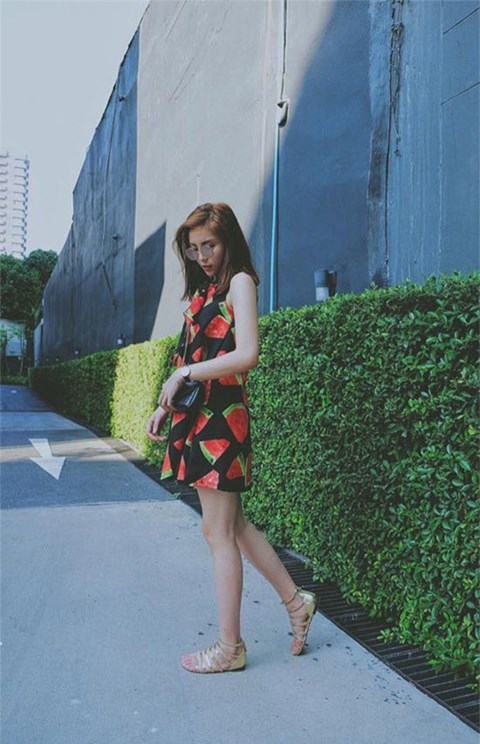 Kỳ Duyên trẻ trung với bộ đầm liền hoạ tiết miếng dưa hấu nhân dịp đi du lịch xứ sở Chùa Vàng vào đầu năm. Phụ kiện xăng đan ánh kim, túi mini cũng phù hợp với trang phục.