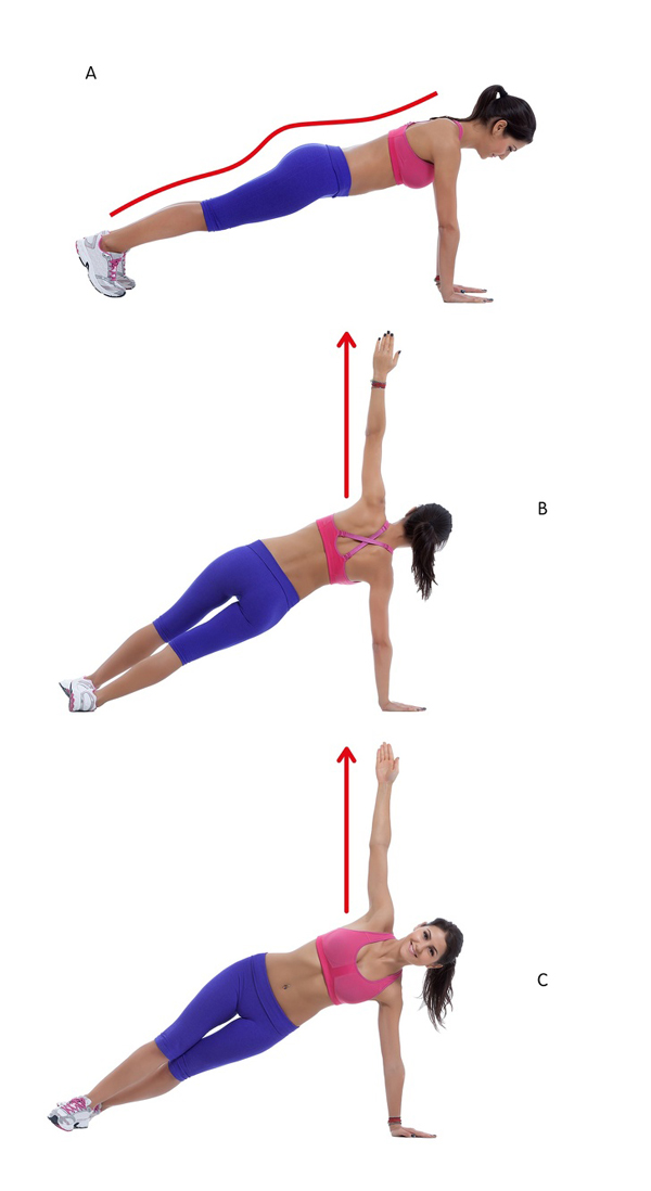 Chuẩn bị ở tư thế chống đẩy, nghiêng người lần lượt sang hai bên với cánh tay mở rộng, hướng thẳng lên trời. Thực hiện động tác 20 lần mỗi bên.