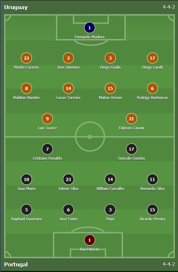 Uruguay (4-3-1-2): Muslera; Caceres, Gimenez, Godin, Laxalt; Nandez, Torreira, Vecino; Bentancur; Suarez, Cavani