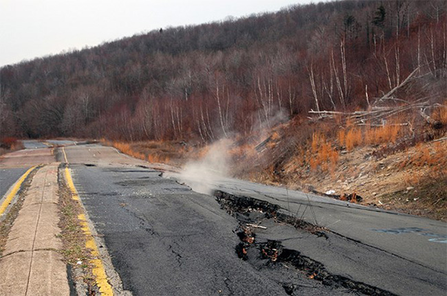 Được xây dựng trên một mỏ than, thành phố phát triển mạnh mẽ cho đến năm 1962 khi một ngọn lửa bắt đầu xuất hiện. Thoạt đầu, người dân địa phương không cảm thấy lo lắng gì. Nhưng, 10 năm sau, một vài người trong số họ bị rơi xuống những vết nứt nghi ngut khói đột nhiên xuất hiện trên vỉa hè. Chính quyền vội vàng sơ tán người dân trong thị trấn. đến này dân số của thành phố chỉ còn có 7 người.