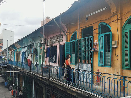 Bên trong con hẻm rộng chừng hơn 2m, một khung cảnh hiển hiện trước mắt như tái hiện cuộc sống của cư dân từ cách nay hàng thế kỷ. Vài chục căn hộ san sát nhau, được phân chia ranh giới chỉ bởi bức tường ngăn. Mỗi căn hộ được gia chủ sơn bằng nhiều màu sắc khác nhau. Con hẻm như bức tranh ghép bởi nhiều mảng màu vui mắt.