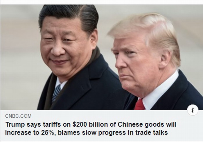Theo nguồn tin từ CNBC, ông Trump sẽ đánh thuế 25% lên số hàng 200 tỷ USD của Trung Quốc (số hàng này đang bị đánh thuế 10%) vào thứ 6 tuần tới tức ngày 10-5-2019. Ngoài ra ông Trump tiếp tục cảnh cáo tăng thêm 25% lên số hàng còn lại 325 tỷ USD.