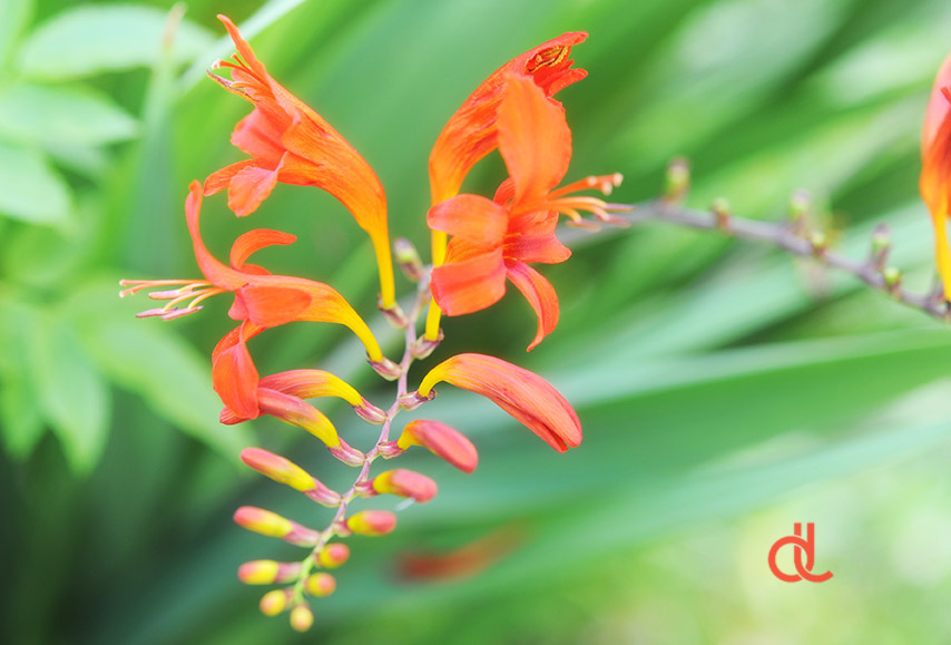 Crocosmia 'Bressingham Blaze màu đỏ and Crocosmia masonorum màu cam.
