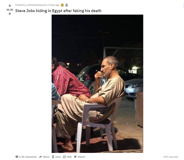 Bức ảnh trên đã nhận được hơn 80.000 lượt upvote trên Reddit chỉ sau vỏn vẹn 3 ngày, đủ để nói lên độ kinh ngạc và sửng sốt mà nó gây ra. Mặc dù nhiều người cho rằng đây chỉ là một sự trùng hợp ngẫu nhiên đến lạ kỳ, số khác vẫn hùng hồn đứng ra tranh biện, bảo vệ quan điểm của riêng khi cho rằng Steve Jobs thật sự vẫn còn sống...